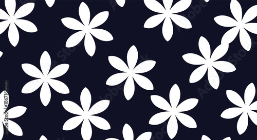 Seamless floral pattern featuring simple, stylized white seven-petal flowers scattered across a solid dark navy blue background design.