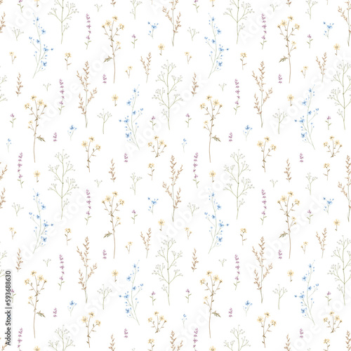 Seamless floral pattern with meadow dried flowers isolated on white background. Watercolor hand drawn illustration sketch