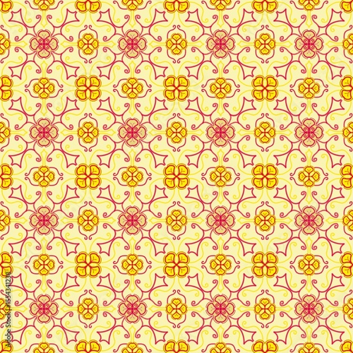 seamless floral pattern,flowers,jars,staffs,leaves,japanese lanterns with yellow as a background,created from curved lines in geometric patterns to sarong,tile,fabric and printed patterns.