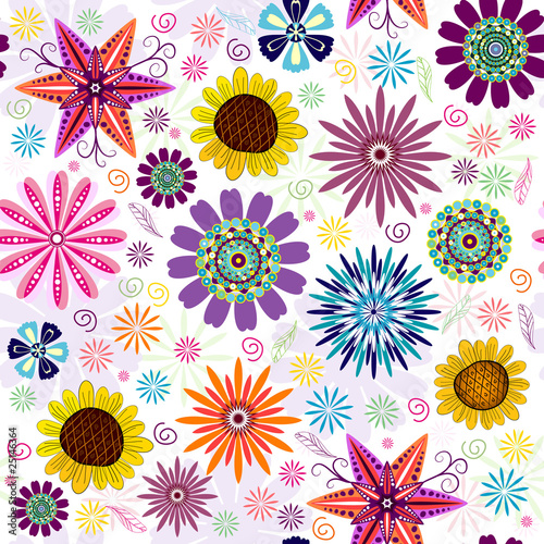 flower, floral, wallpaper, seamless, pattern, sunflower, background, carved, circle, fractured, crossing, curl, decoration, decorative, design, graphic, handiwork, illustration, image, violet, blue, mosaic, orange, painted, pink, red, repeating, retro, high-coloured, white, yellow, vector