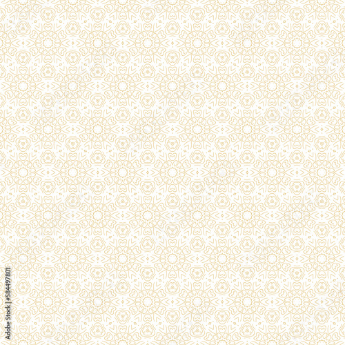 Seamless geometric pattern for wrapping, fabric and ornament. Vector illustration in gold color with star , petals, and floral ornament.