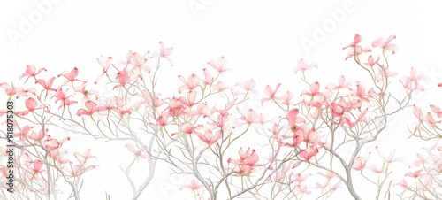 Seamless Horizontal Watercolor Pink Dogwood trees isolated on White background