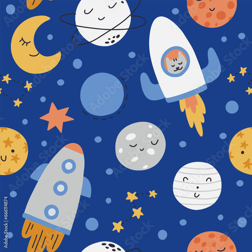 Seamless kids space pattern. Creative nursery background. Ideal for kids design, fabric, packaging, wallpaper, textiles, clothing