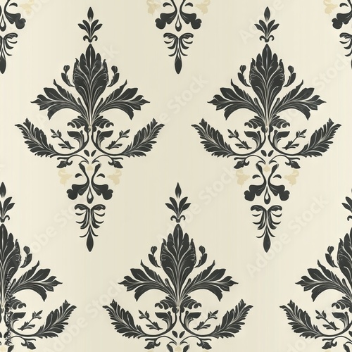 Seamless Pattern - Elegant damask pattern in black and cream with leaf and floral elements.