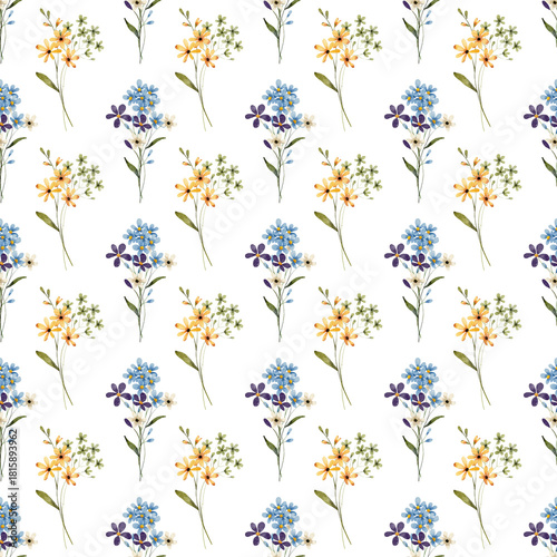 Seamless pattern, blue flower background with watercolor bouquets. Repeat fabric wallpaper print texture. Perfectly for backdrop, wrapped paper.