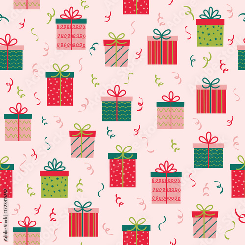 Seamless pattern featuring festive gift boxes with bows and confetti in pink, green, and red hues, for holiday and birthday celebration-themed designs, hand drawn, vector illustration.