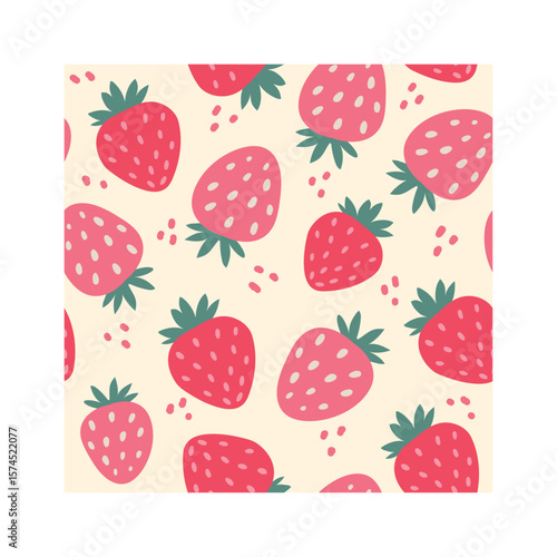 Seamless pattern featuring stylized strawberries in shades of pink and red, scattered across a cream background, creating a cheerful and vibrant design suitable for various applications