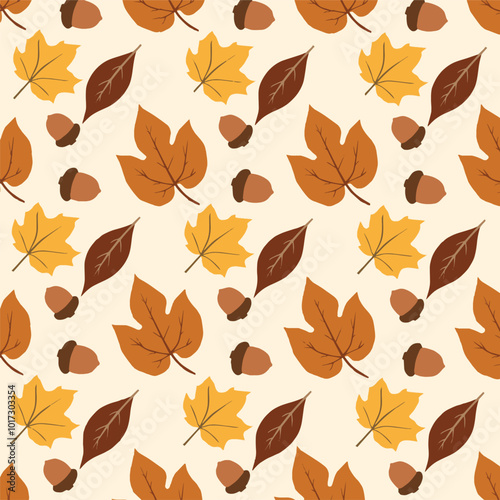 seamless pattern of autumn leaves and acorns in shades of brown, orange, and yellow on a beige background. vector, illustration, background.