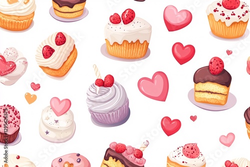 Seamless pattern of cupcakes, cakes, and desserts with hearts, cherries, and strawberries in a cute and colorful style perfect illustration for birthdays and celebrations.