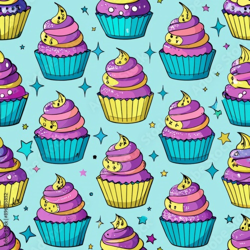 Seamless pattern of cupcakes with glittery frosting, Generative AI