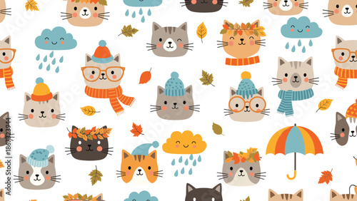 Seamless pattern of cute cat faces wearing autumn scarves, hats, and leaf wreaths with clouds, rain, and fall leaves.