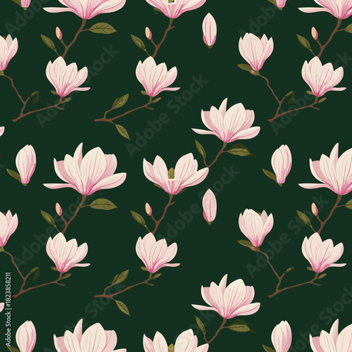 Seamless Pattern of Delicate Pink Magnolia Flowers on Dark Green Background.
