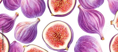 Seamless Pattern of Fresh, Juicy Figs A Vibrant Display of Purple and Red, Whole and Halved