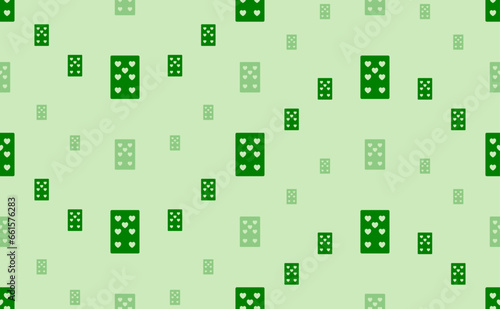 Seamless pattern of large and small green seven of hearts playing cards. The elements are arranged in a wavy. Vector illustration on light green background
