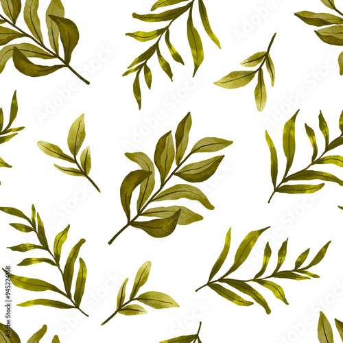Seamless pattern of olive leaves and branches, plants. Greenery and flora, wedding decor. Background summer and spring illustration hand drawn on isolated. Fabric and paper