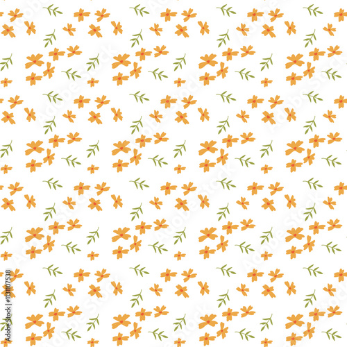 Seamless pattern of orange flowers with green leaves on white background.
