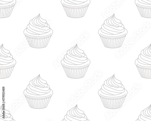 seamless pattern, cupcake, outline, frosting, graphic, design, muffin, bakery, dessert, sweet, food, repetitive, background, wallpaper, textile, cardboard box, vector, illustration, doodle, vignetting, simple, minimalist, cake, pastry, confectionery, wrapper, treat, white background, monochrome