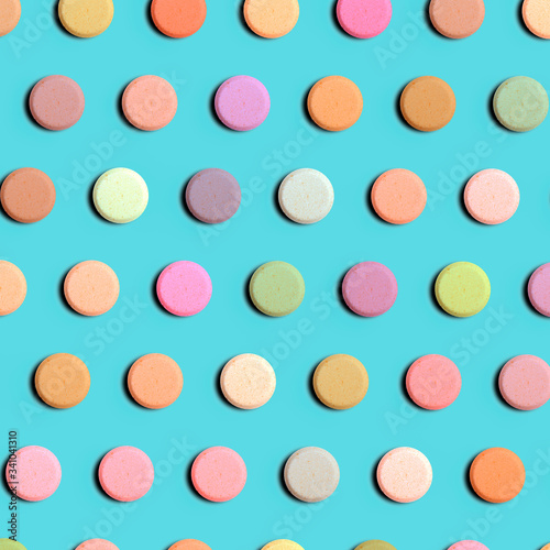 Seamless pattern of pharmaceutical pills or vitamins on a blue background. Multi-colored pills on a blue background.