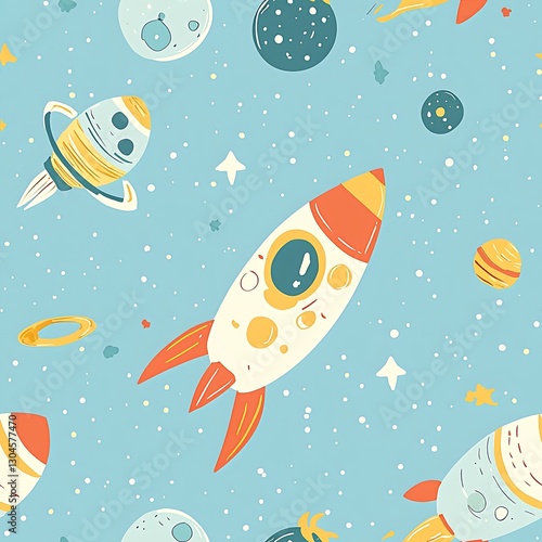 Seamless pattern of rockets and planets in a whimsical space-themed design for backgrounds
