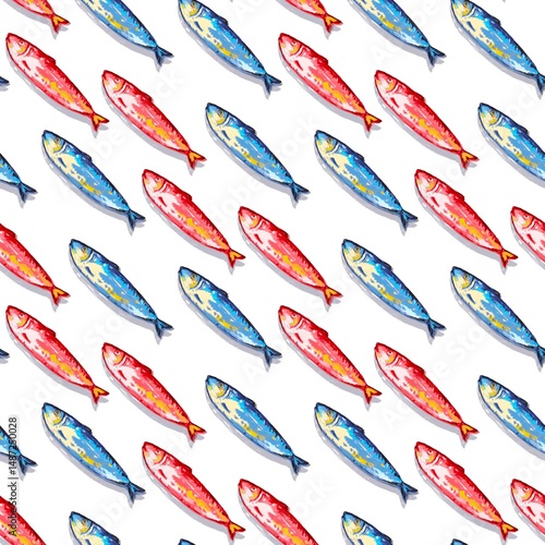 Seamless pattern of sardines Hand drawn fabric pattern. Cute bright colors Summer Tropical On white background