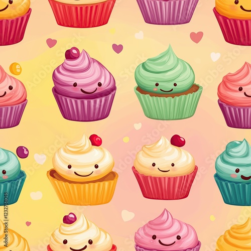 cupcake, pastel, whimsical, illustrated, decoration, cute, various, topping, seamless, delicate, colourful, cake, cupcake, sweet, food, birthday, dessert, muffin, chocolate, cream, illustration, pink, set, cherry, pattern, bakery, candy, celebration, cup, cartoon, party, delicious
