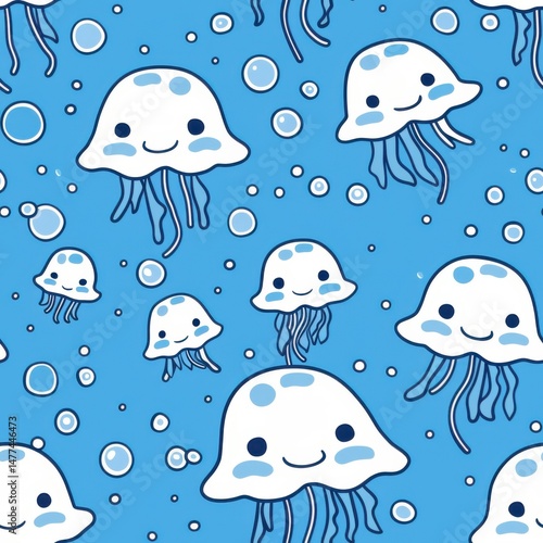 seamless pattern of tiny cartoon starfish and jellyfish icons, simple flat minimal illustration, light pastel colors