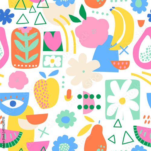 Seamless pattern with abstract fruits, shapes, eye, heart, flowers. Modern pastel texture for fabric, textile, packaging. Vector illustration