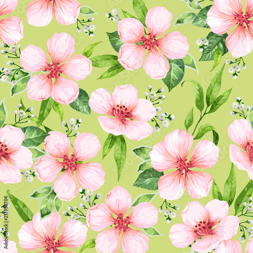 Seamless pattern with blossoming apple tree flowers on green background. Elegance vintage endless texture in watercolor style .