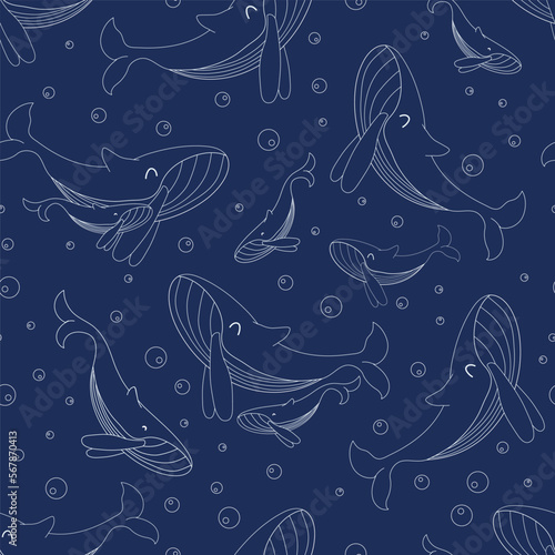 Seamless pattern with blue whales vector illustration. Mother and child. Sea mammals and air bubbles. Cute line doodle characters. Isolated on dark blue backdrop