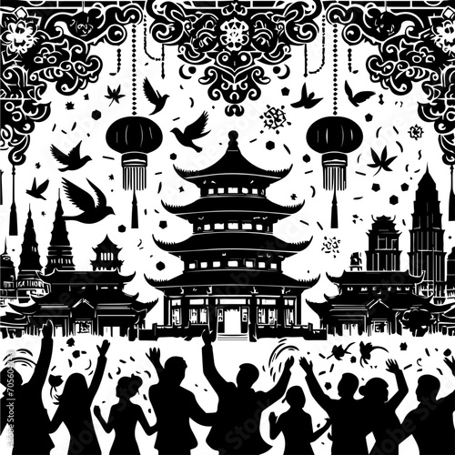 Seamless pattern with Chinese temple and people. Vector illustration. Illustration of a Chinese New Year background with people silhouettes.