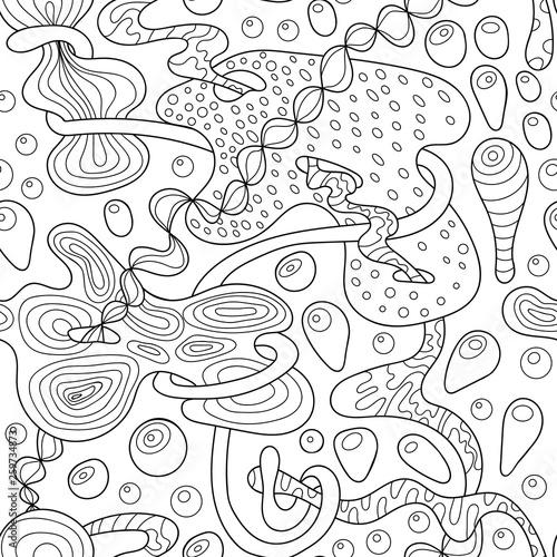 Seamless pattern with colorful magic mushrooms in doodle style. 60s hippie psychedelic art. Vector. Print for fabric