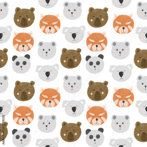 Seamless pattern with cute bear faces (bear, polar bear, panda, red panda, koala), hand drawn isolated on a white background