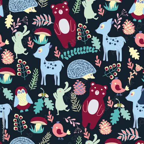 Seamless pattern with cute cartoon forest animals baby shower background for children with cute animals - owl, deer, bear, rabbit, hedgehog and bird.