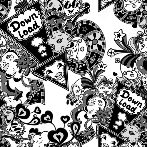 seamless, pattern, texture, decorate, banner, concept, arrow, doodle, monster, cartoon, style, grey, white, black, cloud, music, film, picture, web, cyberspace, site, template, heart, flower, bag, skateboard, enfold, treble clef, star, drink, sunglasses, hand-made, design element, background, creative, vector