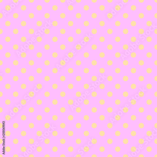 Seamless pattern with dots. Yellow polka dots on pink background. Wallpaper, fabric, card, cover design and decor. Seamless print illustration for kids, girls