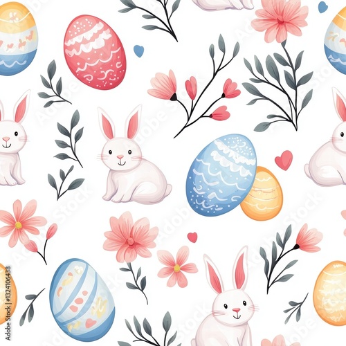 Seamless pattern with Easter Holiday Celebration with Bunnies Eggs and Floral Accents Cute Seamless Pattern Vector Design