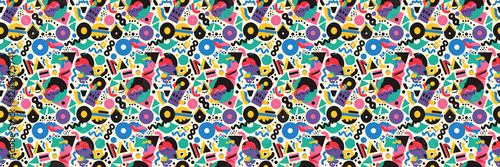 Seamless pattern with geometric shapes in the style. Multicolored vintage background with triangles, circles and squares for textile, fabric and Sudanese fabric art.