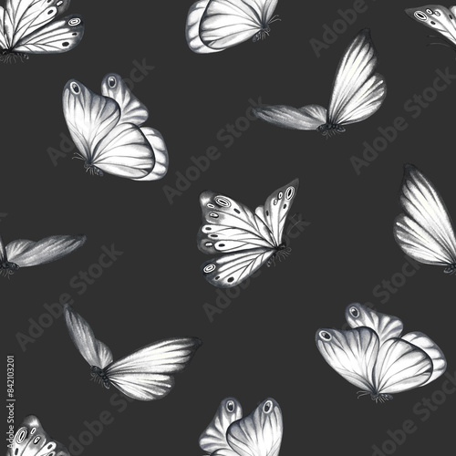 Seamless pattern with grey flying butterflies on a black background. A hand-drawn watercolor illustration. For textiles, wallpapers and backgrounds. For packaging paper and labels, printing