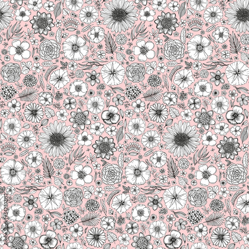 Seamless pattern with hand drawn flowers for design.