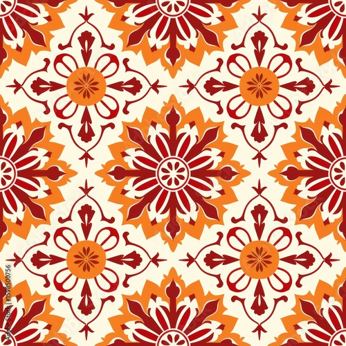 Seamless pattern with intricate red and orange floral mandalas and interconnecting scrollwork on a light cream background