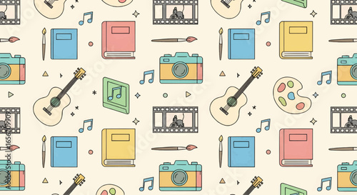 Seamless pattern with musical instruments, notes, film reels, cameras, and entertainment elements in colorful vector illustration.