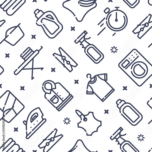 Seamless pattern with outline icons of clothes, towels, cleanig chenistry. Background for laundry, dry cleaning.
