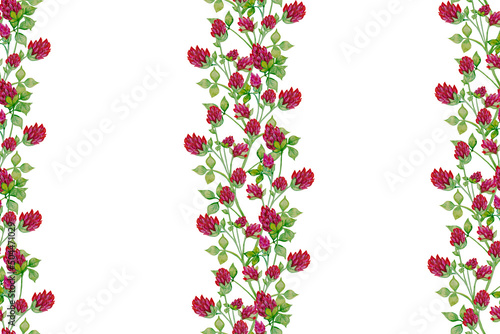 Seamless pattern with painted clover branches arranged in vertical stripes on a white background.