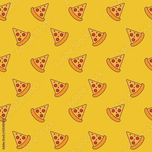 Seamless pattern with pizza slice icons on yellow background. Fast food, street takeaway junk food. Vector illustration