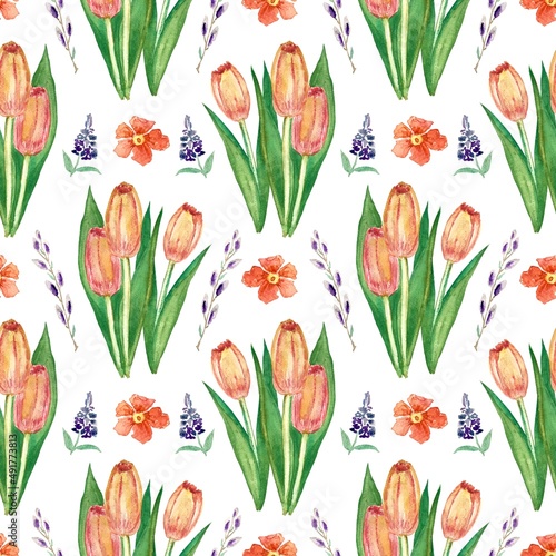 Seamless pattern with tulips and spring flowers for wrapping paper