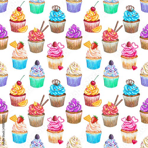 Seamless pattern with watercolor cupcakes.