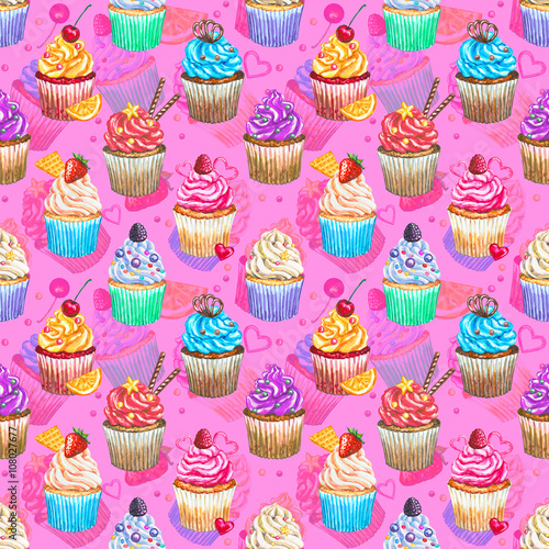 Seamless pattern with watercolor cupcakes.