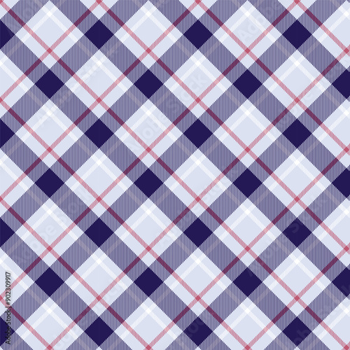 Seamless plaid pattern with navy blue, light blue, and white colors, accented with red lines. The design of intersecting stripes forms diamond shapes and squares, creating a classic tartan look.