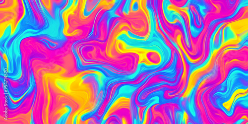 Seamless psychedelic rainbow plama waves pattern background texture. Trippy hippy abstract wavy marble swirls dopamine dressing style fashion motif. Bright colorful neon wallpaper or retro backdrop.