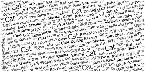 cat, felino, pet, animal, seamless, pattern, word, language, multilingual, text, repeat, wallpaper, background, typographic, font, design, international, concept, global, domestic, lover, abstract, illustration, graphic, art, white, black, simple, modern, communication, education, veterinary, cute, playful, kitten, meow, paw, house, home, companion, mammal, animal kingdom, earth, poster, decoration